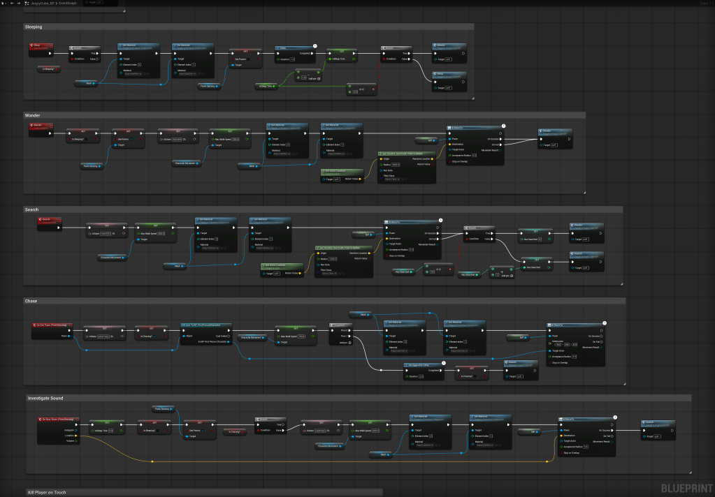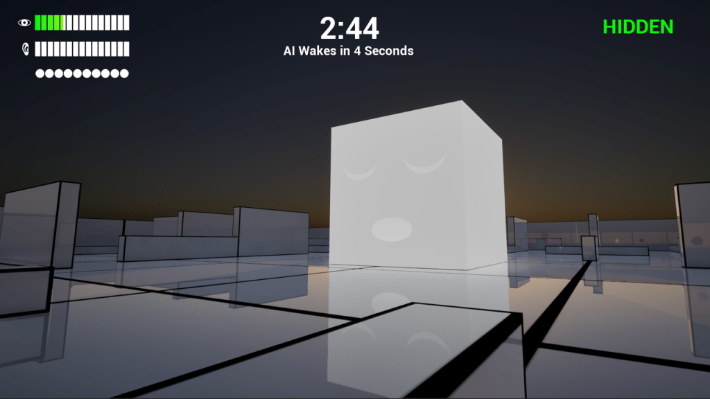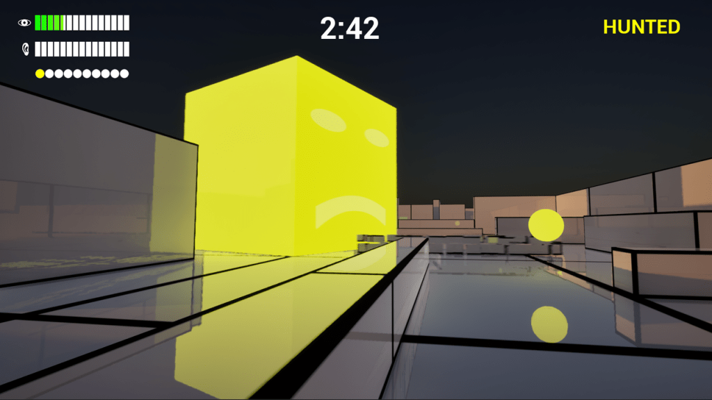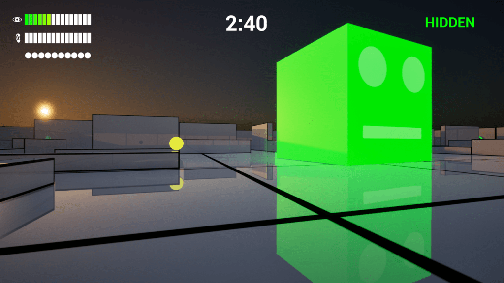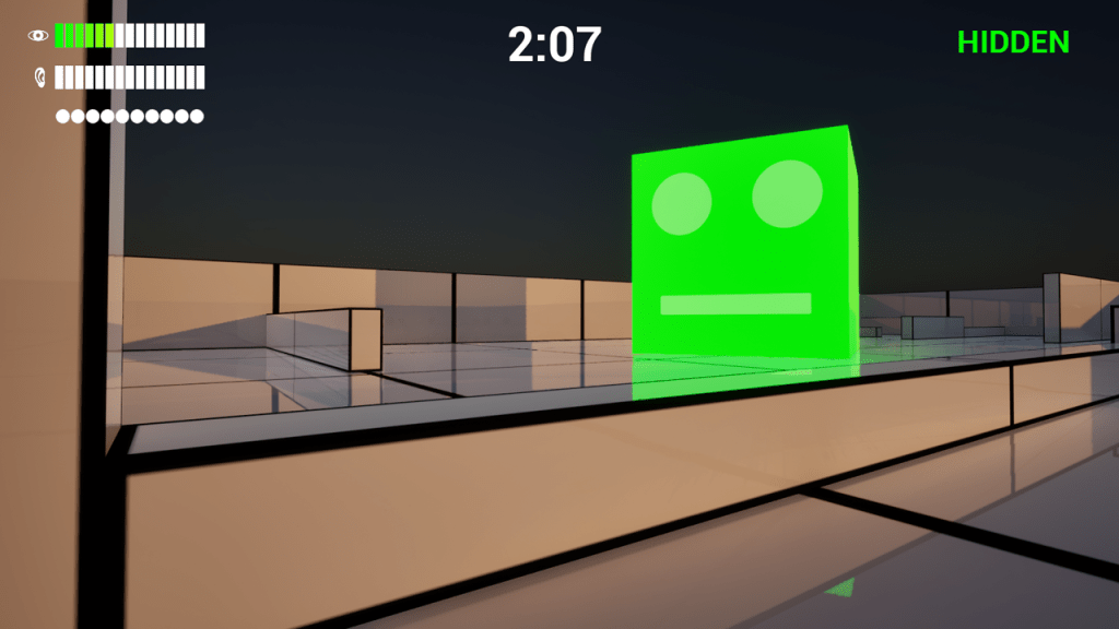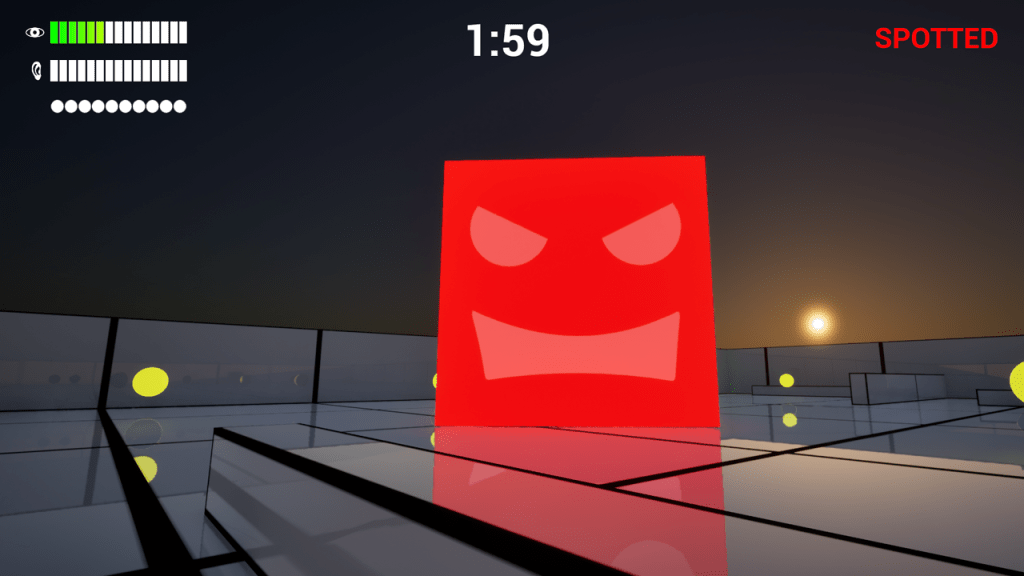 The hunter cube’s expression shows its current state. Green means it’s wandering, yellow means it’s searching for you, and red means it sees you!
